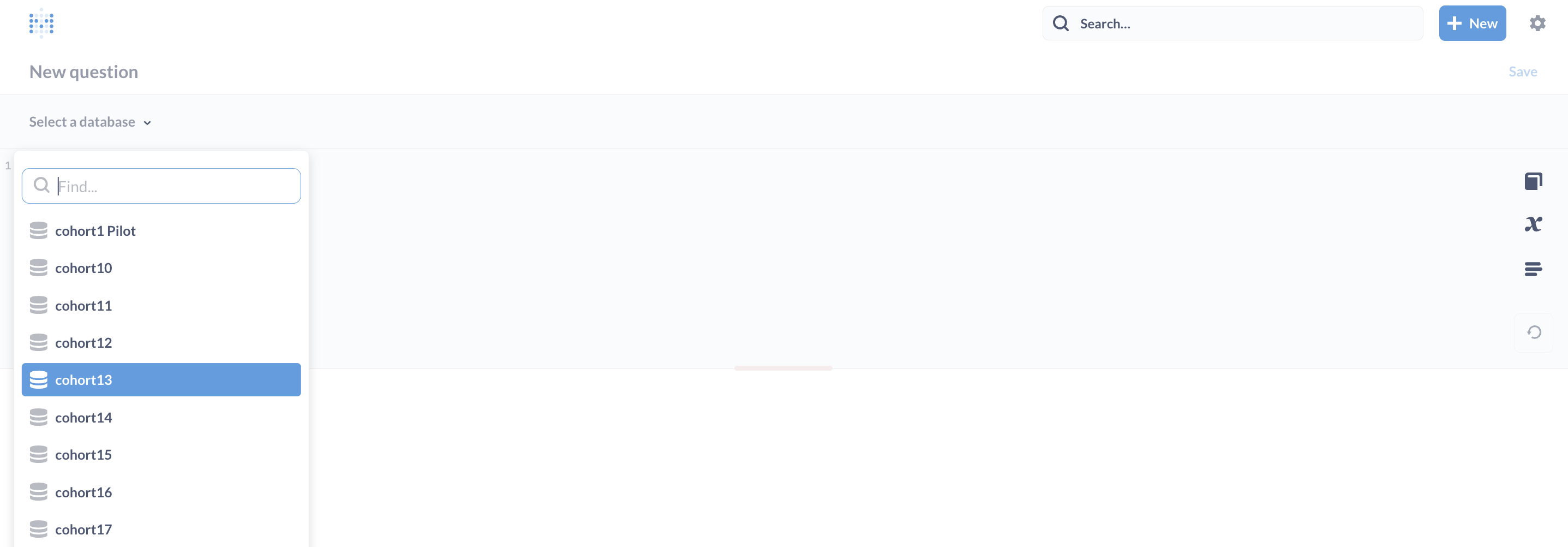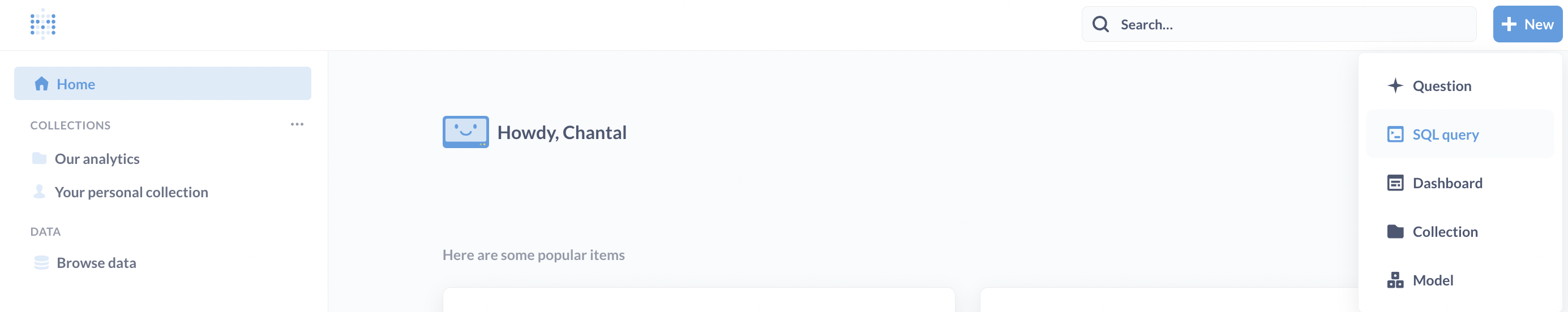 On metabase home page, click on "New" button on the top right and select "SQL query":