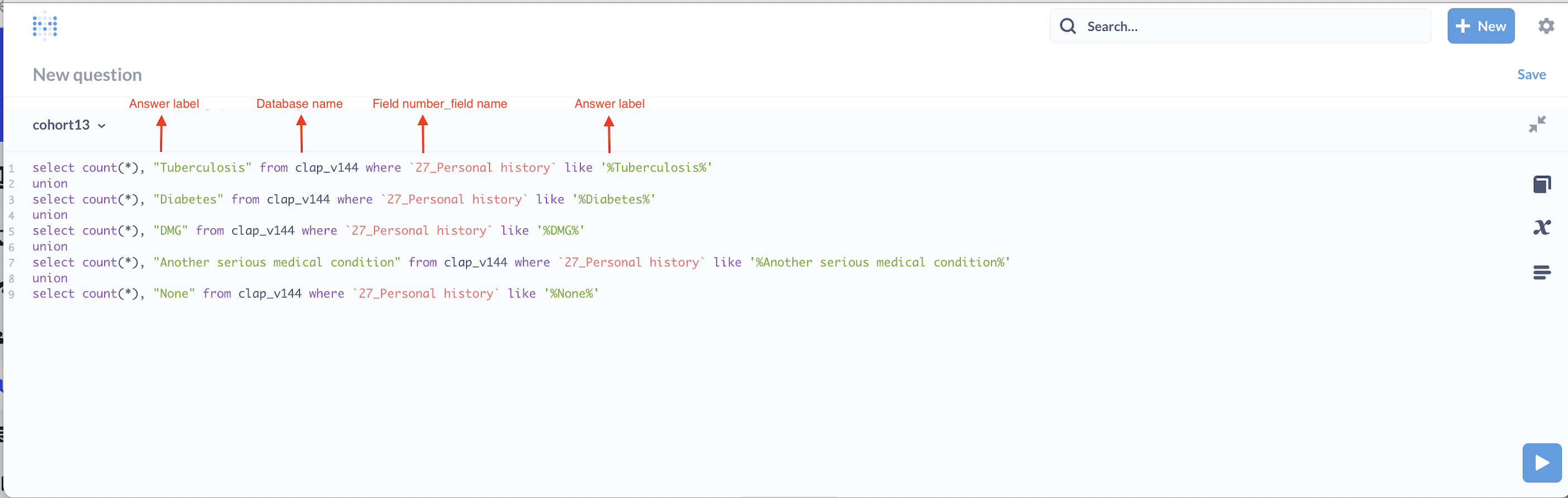 select count(*), "answer label" from survey name where `question number_question label` like '%answer label%'