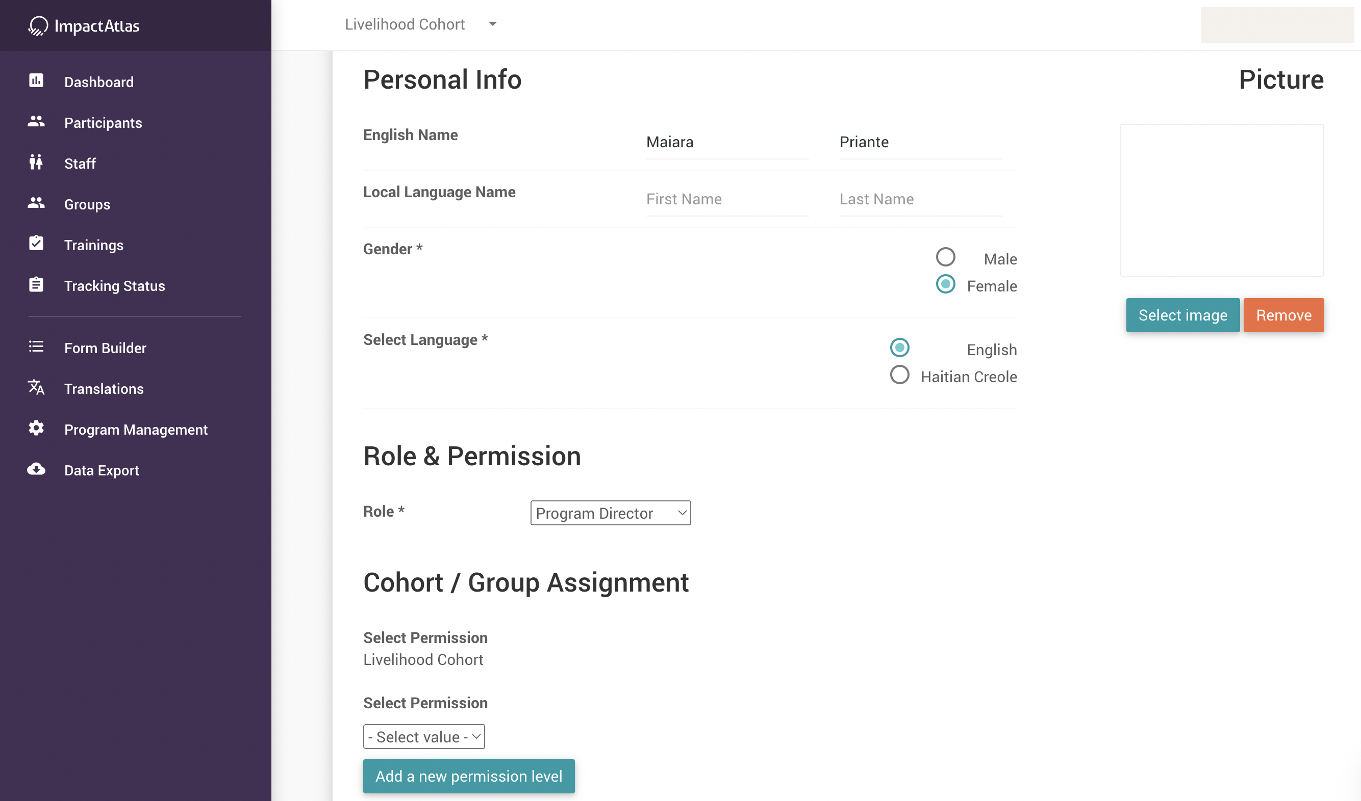Fill out the necessary information to create a new user, then select the role. Based on the selected role, the group structure is going to be loaded and you can select the first group and click on "Add a new permission level" to add this user to a second cohort, for example. You can repeat this step as many times as needed: