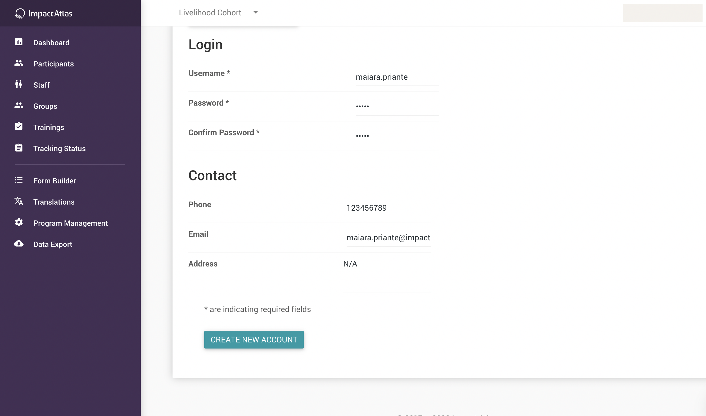 Once you are done selecting the groups, you should fill out the remaining information such as "Login" and "Contact" and then you can click on "CREATE NEW ACCOUNT" in the bottom of the page. The new user should be able to access the account using the username and password set: