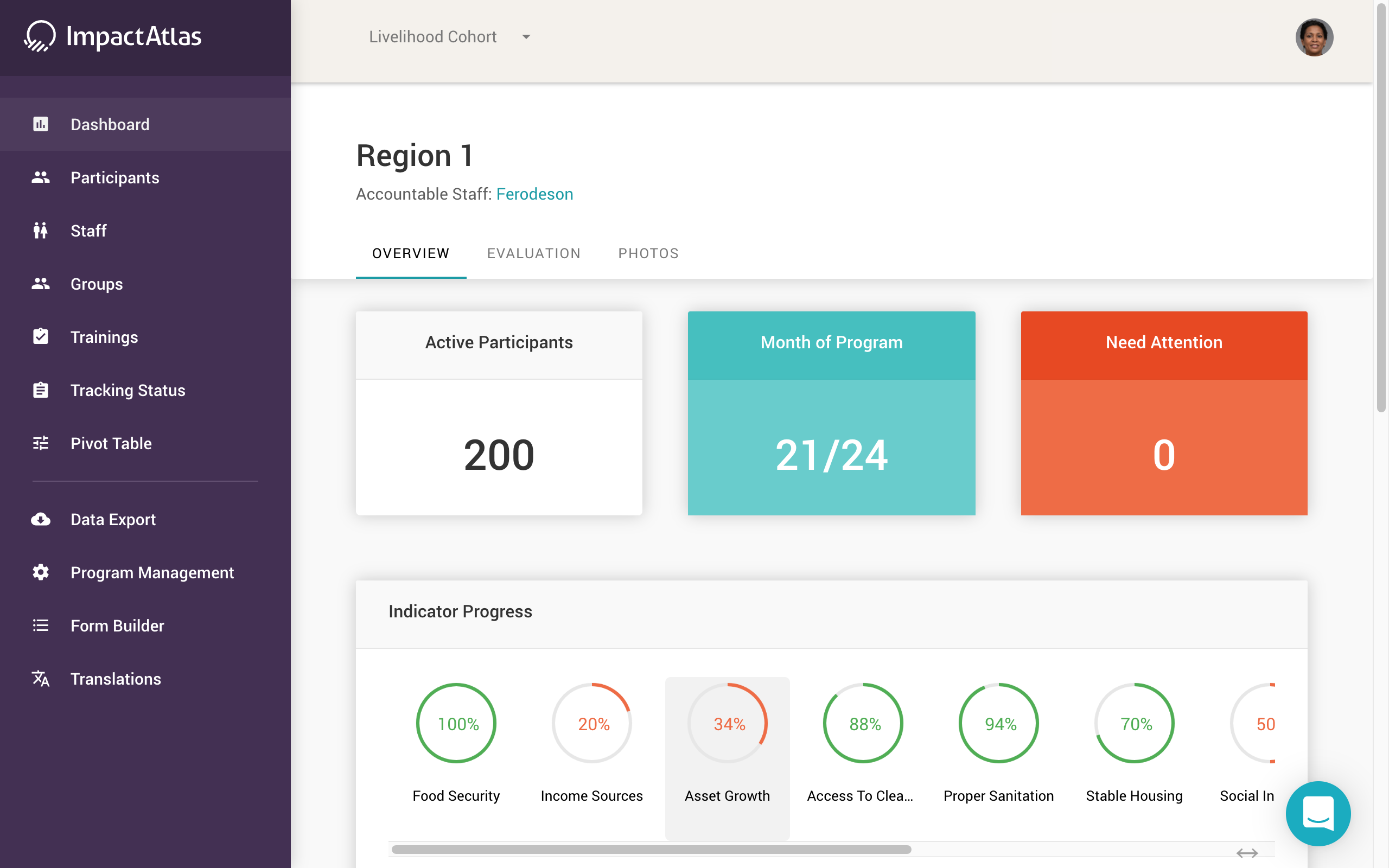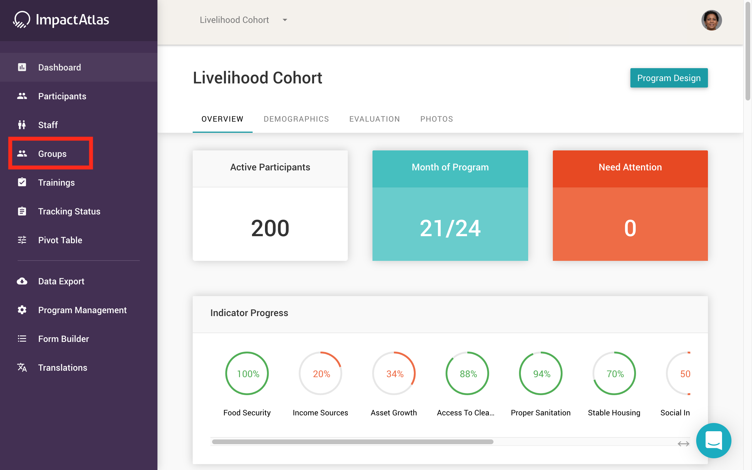 When you click on a particular group, you will see all the data pertaining to it. The top part of any group page will show the number of participants, months of the program that have elapsed, number of participants that need attention, and the progress towards meeting your indicators.