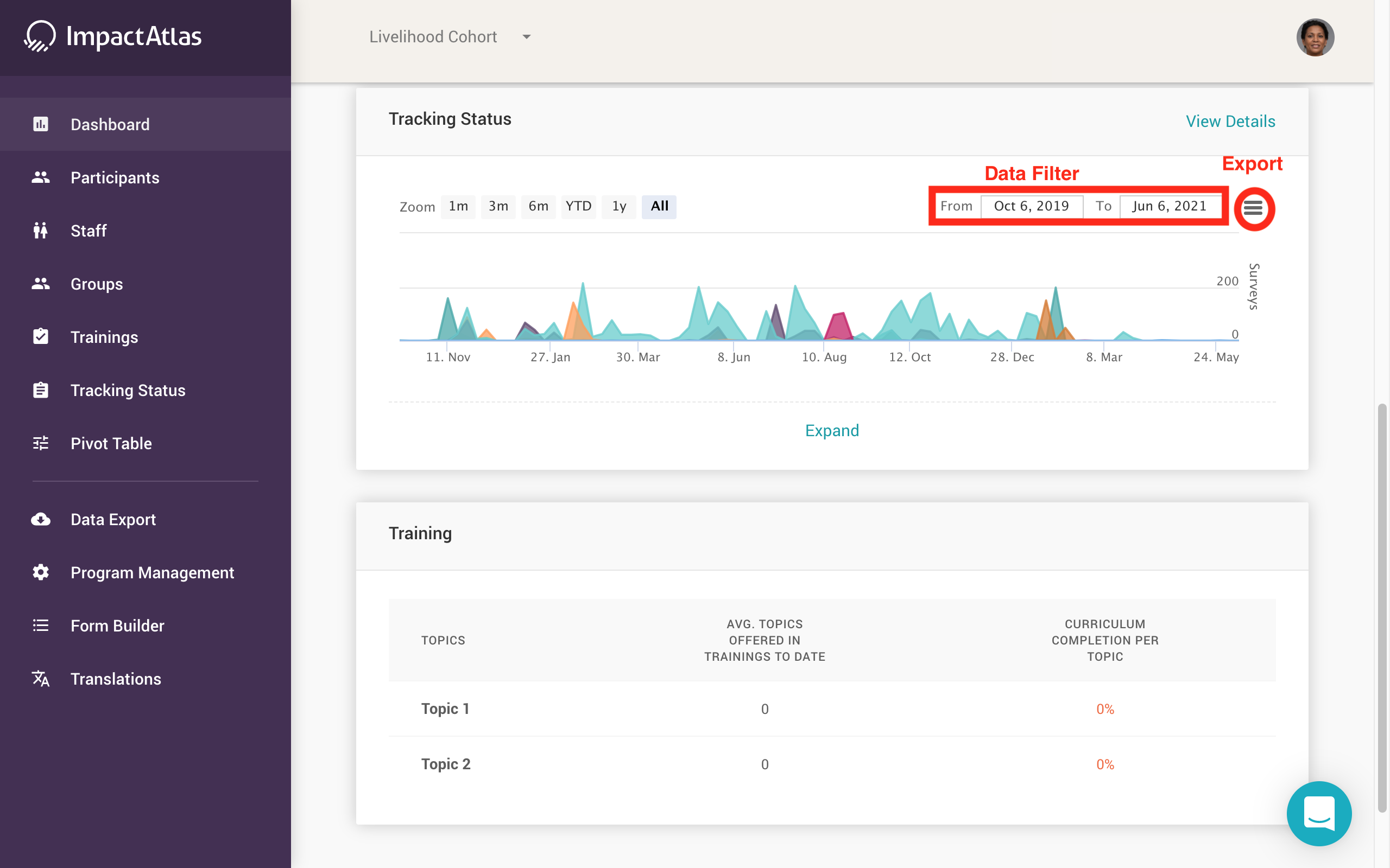 You can also see tracking status, displayed in a chronological line graph, as well as a list of surveys and trainings that have been completed. The picture below also shows how you can export the data (and the graph) as well as filter the data based on specific dates.