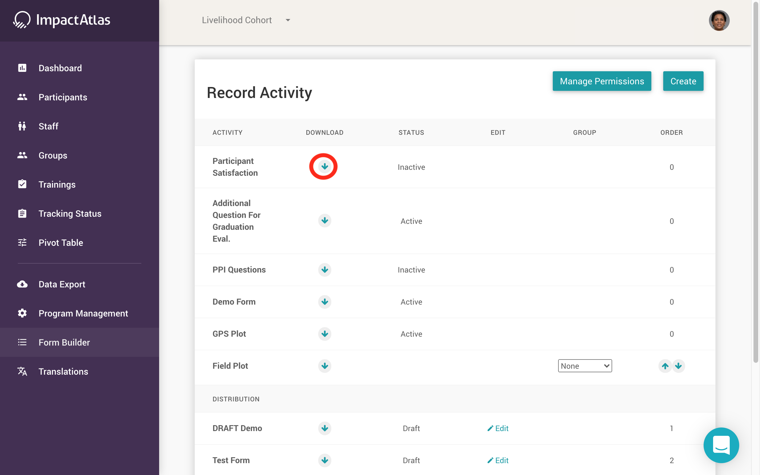 Click on the down arrow button to the right of the survey you wish to see to download a CSV file that can be viewed in Excel: