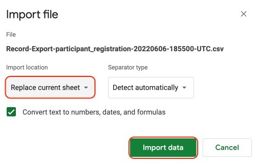 6- New window will pop up. In the import location, set "Replace current sheet" > Import data