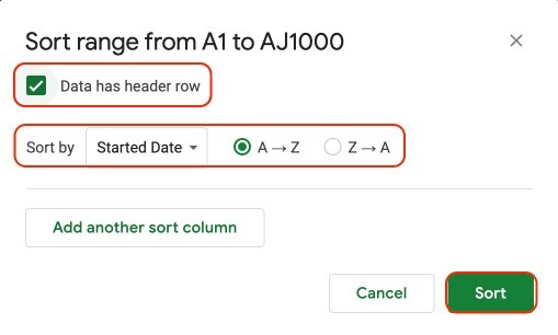 8- Flag "Data has header row" > in the Sort by, determine the way you want to sort the data > Sort