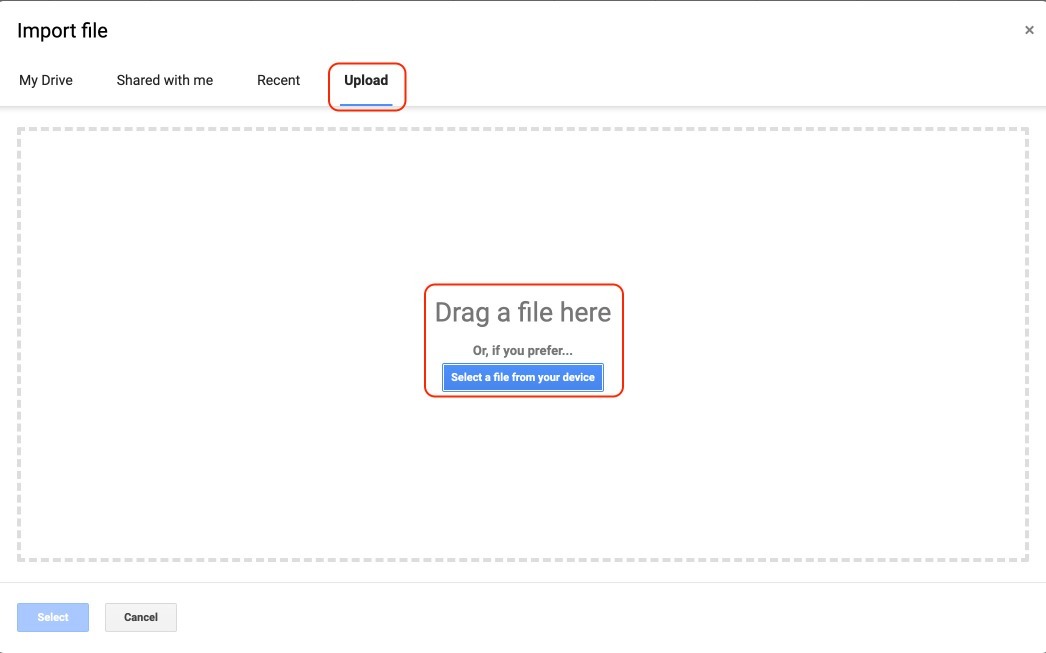 5- Click on Upload > drag and drop or select your file