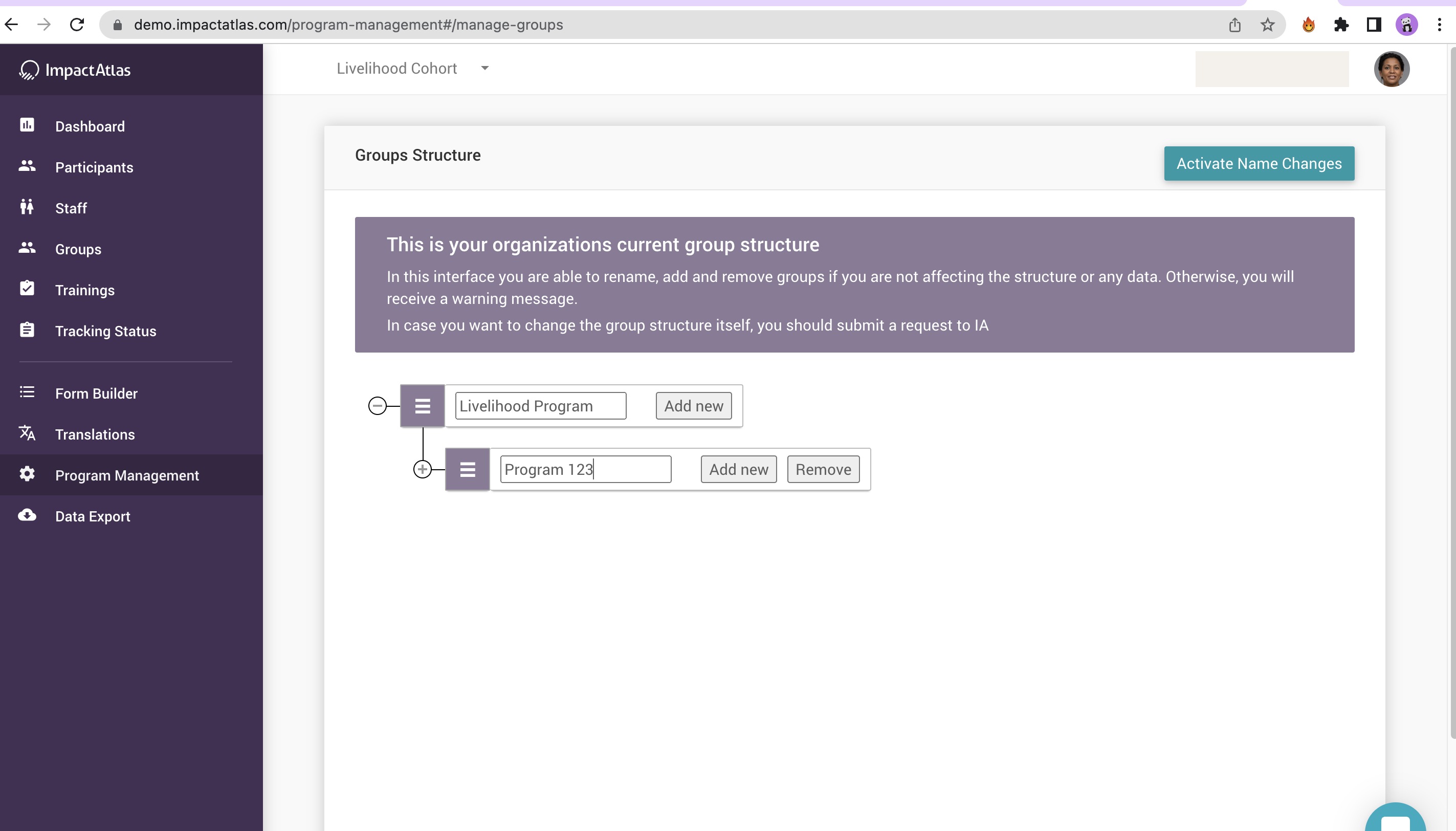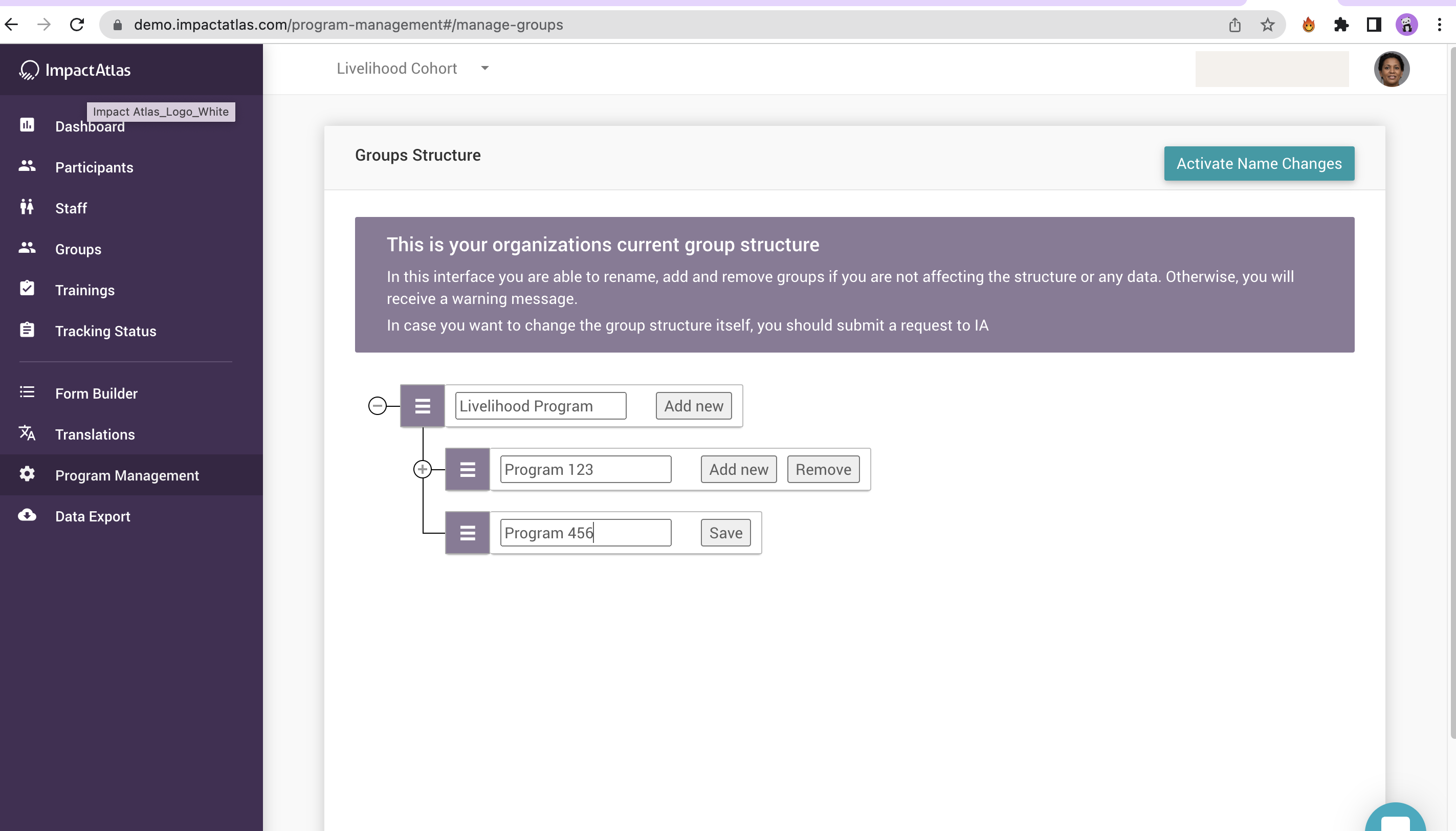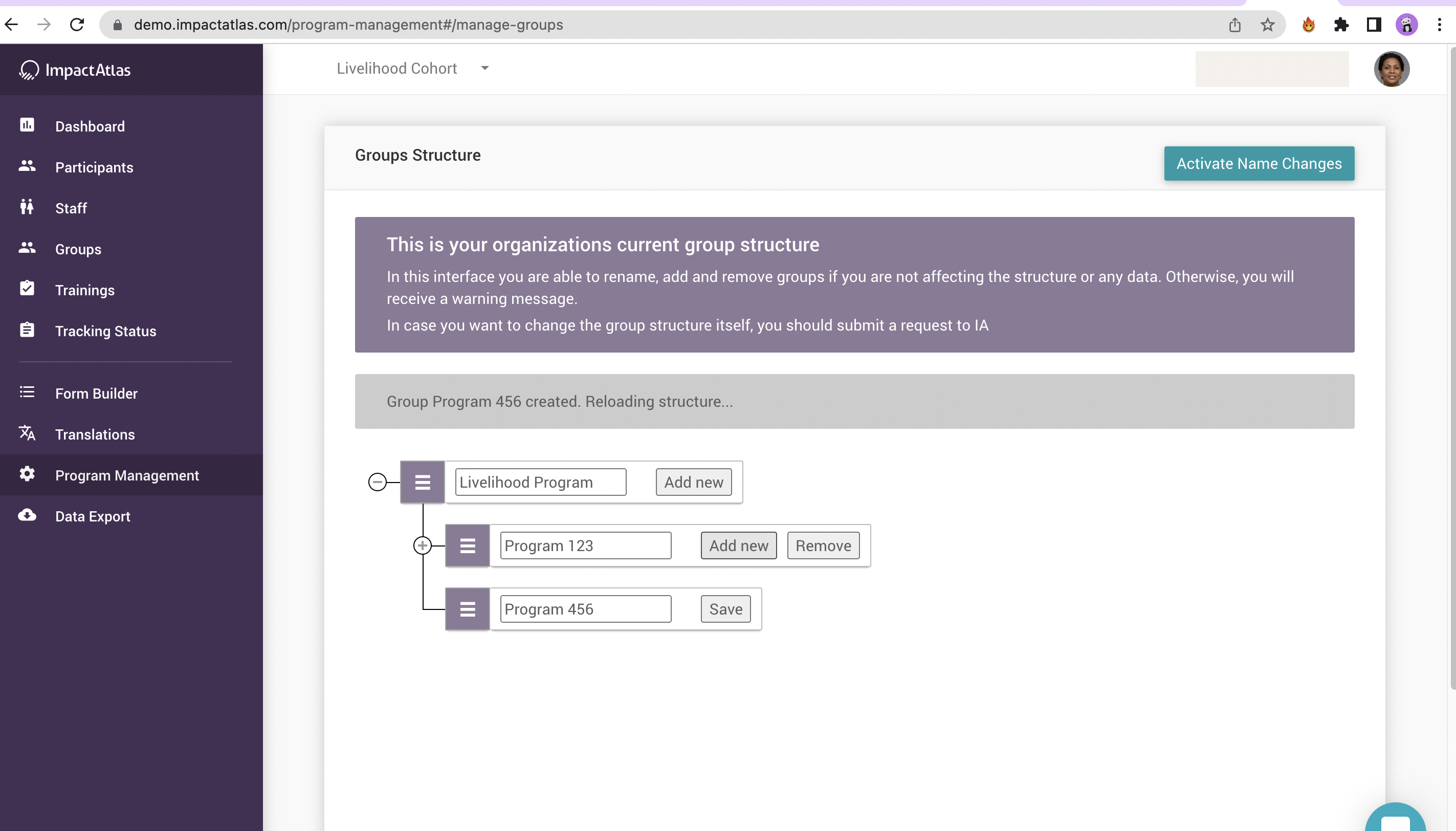 In order to add a new group, you can hit "Add new" under the structure you want to create. In this example, we are going to create a new group under "Livelihood Program":
