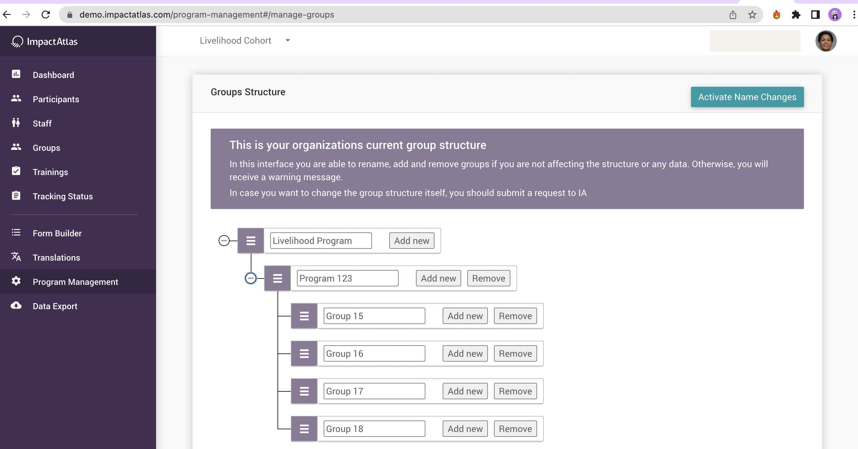 In order to rename a group, you just need to go to the text field, enter the new name and then hit "Activate Name Changes":