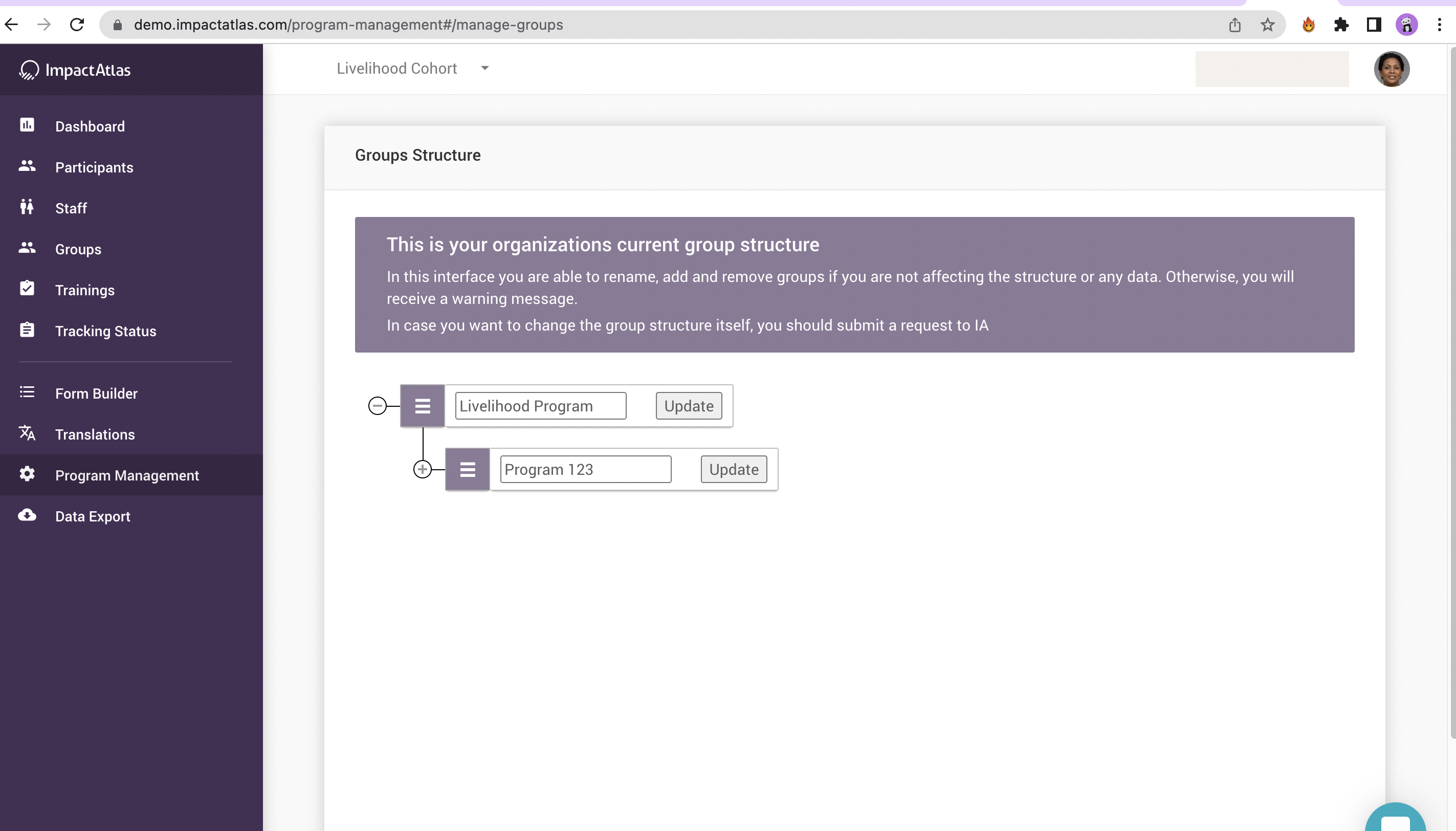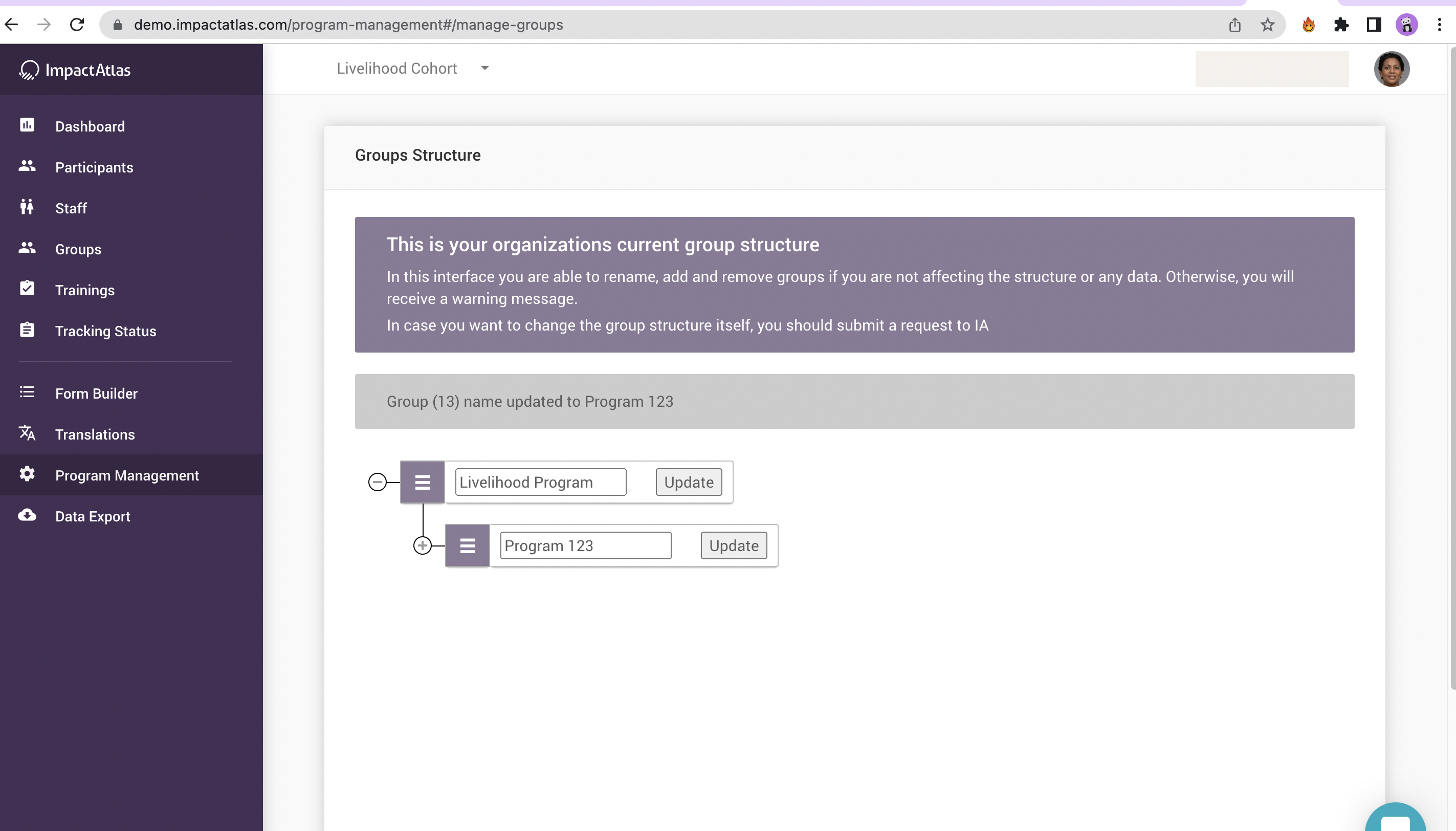 In this example we changed "Program 1" to "Program 123" and then click on "Update" right next to the renamed group: