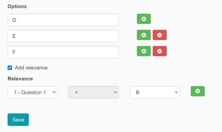 In order to add relevance, create a condition below Add relevance. In this case, Question 2 will only be displayed to a participant if the answer to Question 1 was 'B'.
