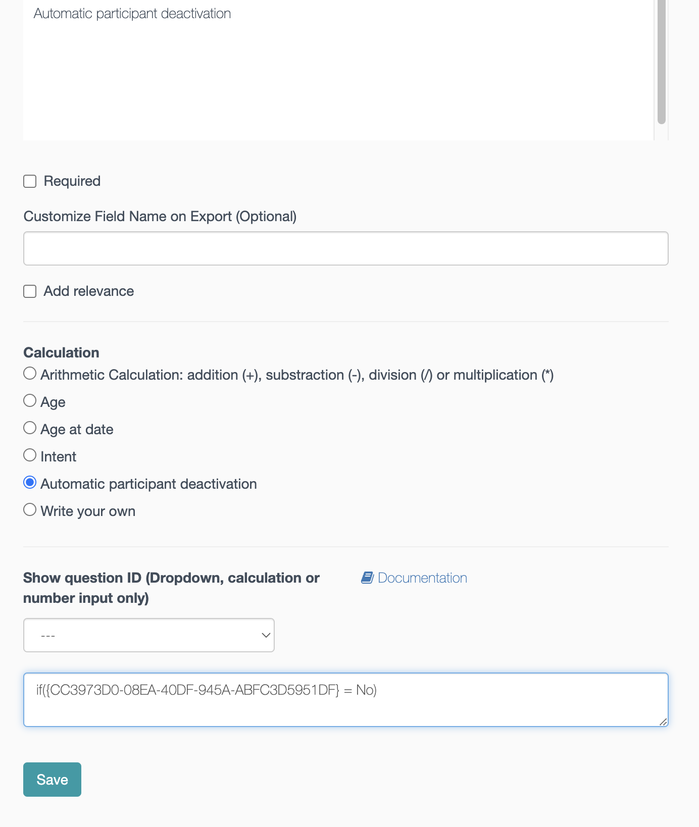 This type of calculation is usually used for selection survey where there are cases that the participant does not meet the criteria to join the program. To use it, you need to refer to the question (s) that will be the trigger to deactivate the participant: