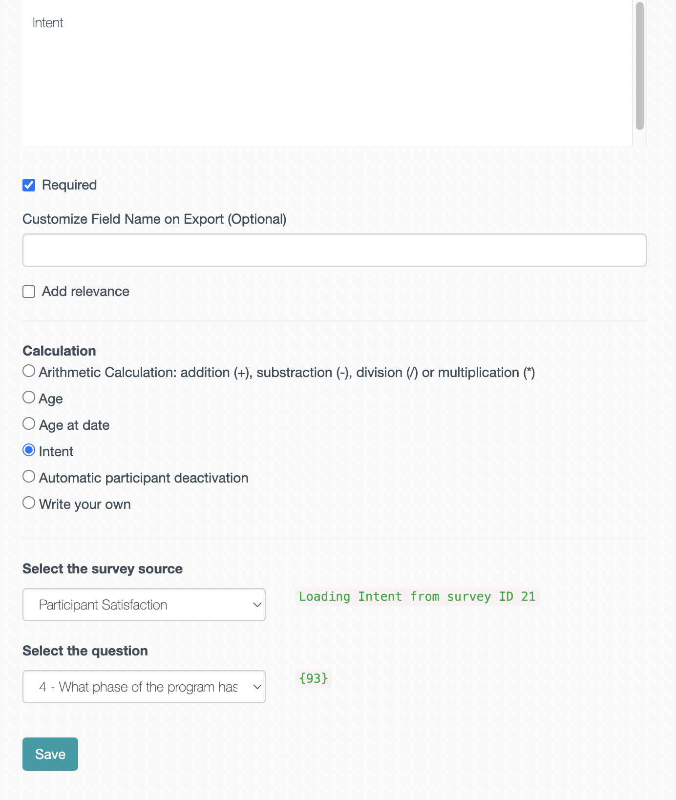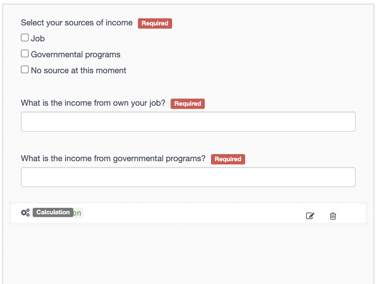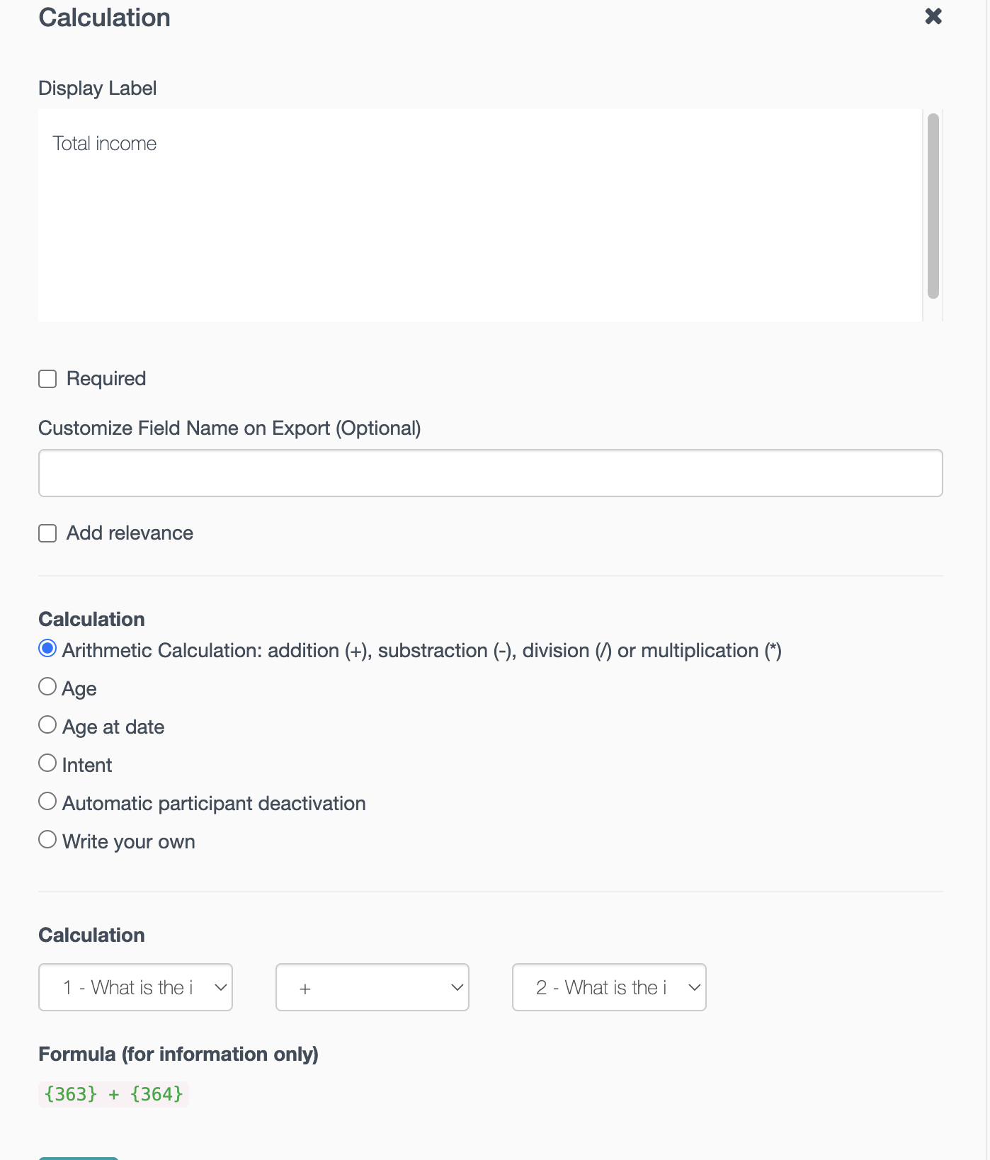 Calculation is one of the element types available in the form builder when creating or editing a survey. As the name suggests, calculations are used automatize updates or visibility of certain data points. For example, if you want to know the total income of the family based on different sources. Or, if you want to have visibility of the participant actual age based on the date of birth and so on.