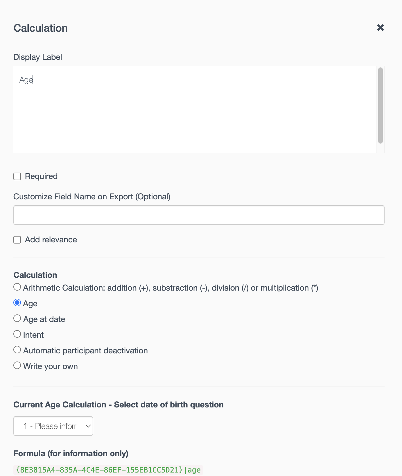 It is very straight forward to use age or age at date calculation, you just need to have a date of birthday question in date format and refer this question in the calculation as the example below: