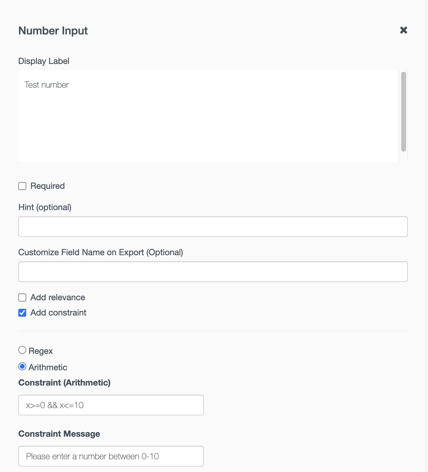 If the user does enter or select a response, they will only be allowed to proceed to the next question when the expression in your constraint column evaluates to true. If the user tries to move forward with a non-blank response but the expression is false, then a generic message "That entry is invalid" will appear. You can also customize your own message that helps the user to understand what value is expected.