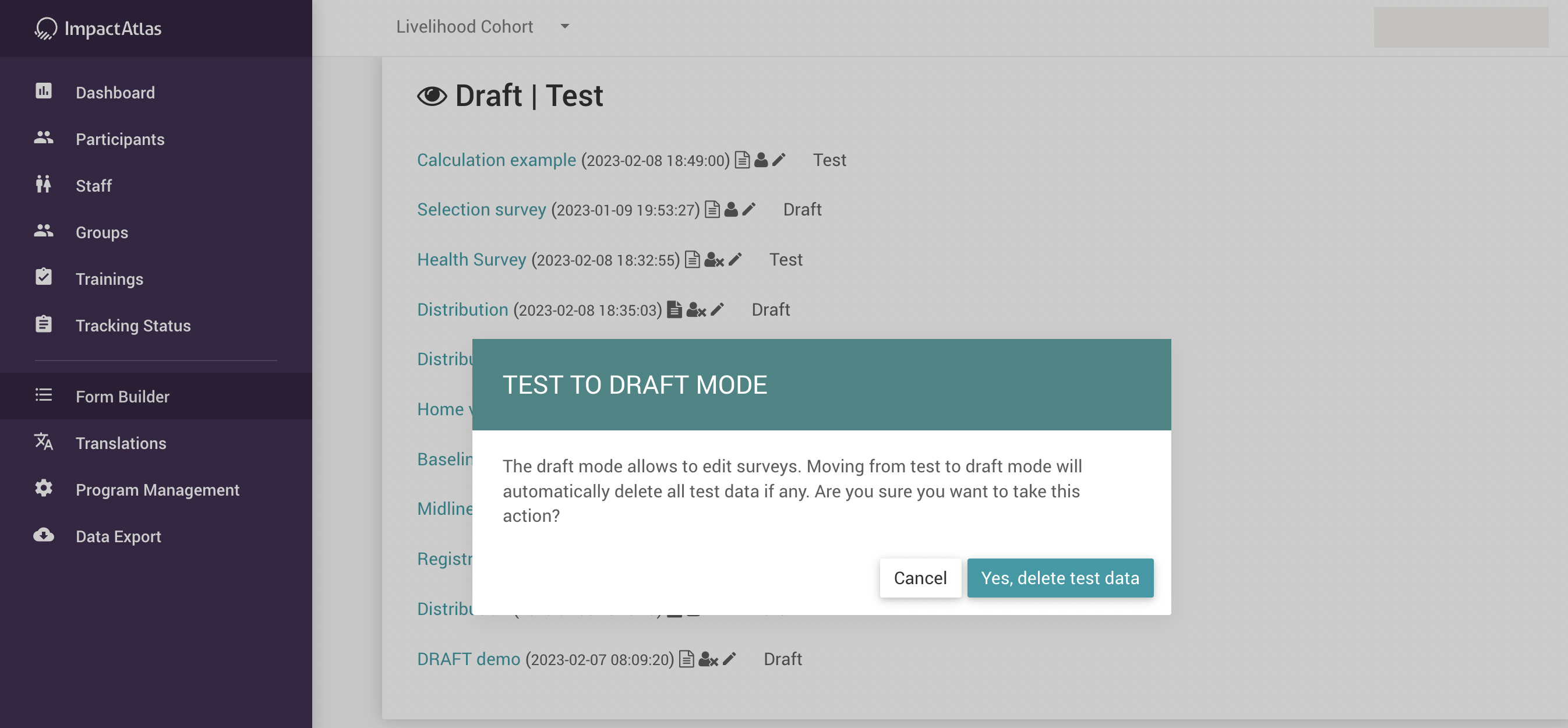 If you agree, you click on "Yes, delete test data" and the test data will be automatically deleted and the survey will be in draft mode for edition;