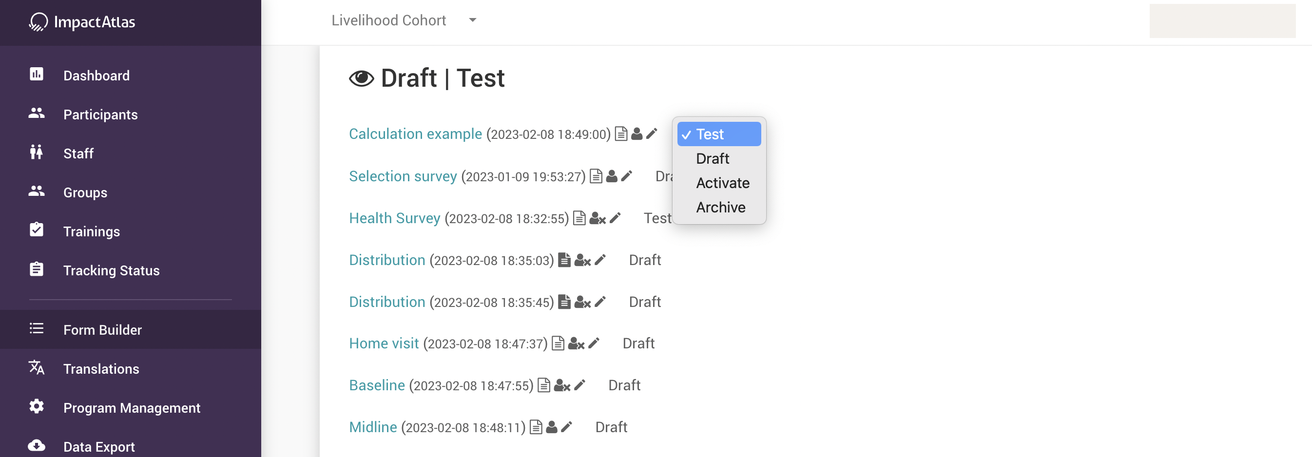 - Draft: create and edit a survey;