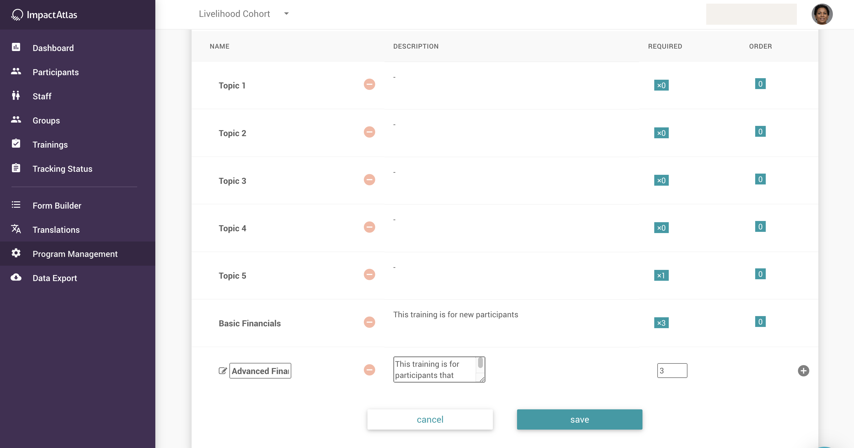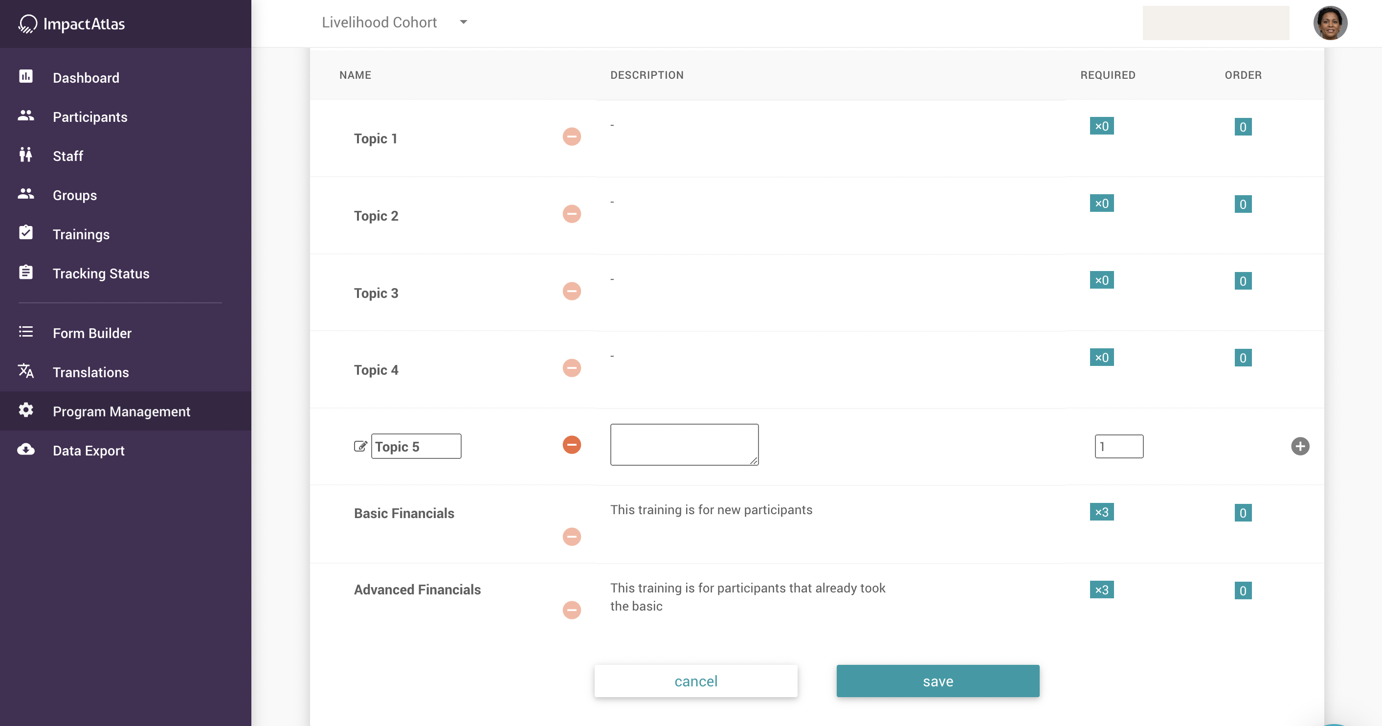 In case you want to delete a training topic, you just click on the delete button right next to the corresponding topic: