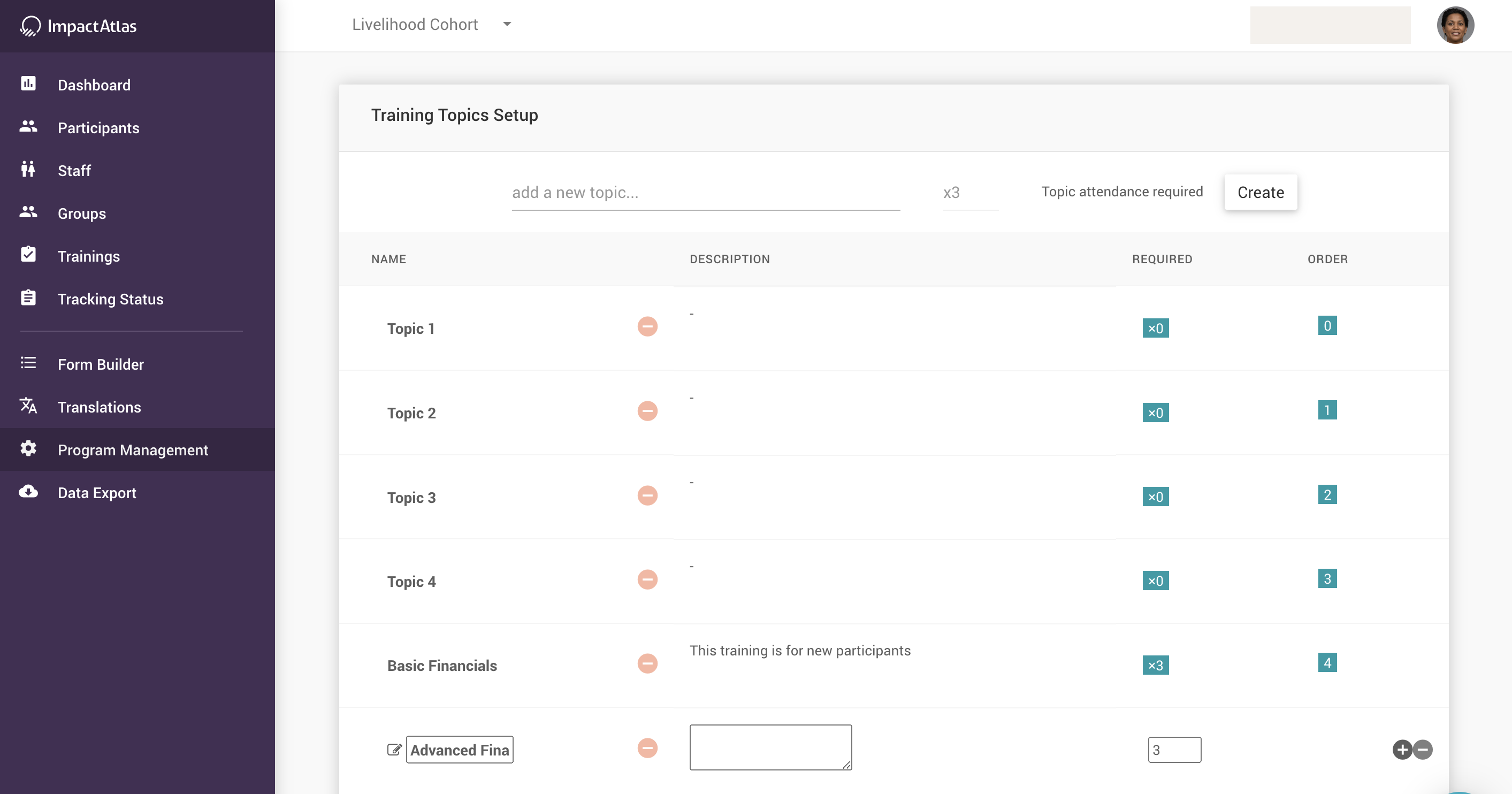 You can also determine the order the training topics are going to be displayed in the page. To do so, you need to mouse over the right side to appear the minus and plus signs. Those buttons are going to define the order number as shown in the screenshot below. The sort is from smallest (0) to the biggest: