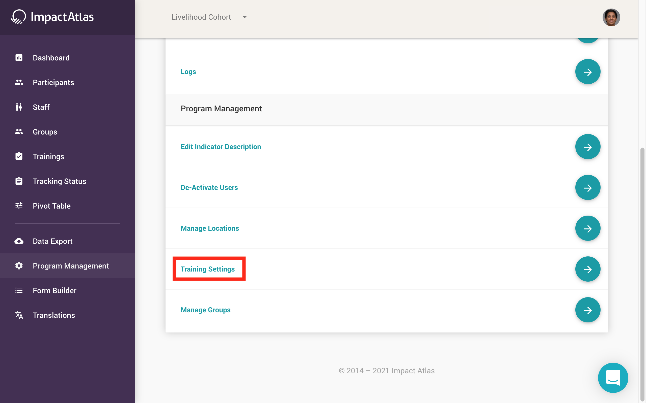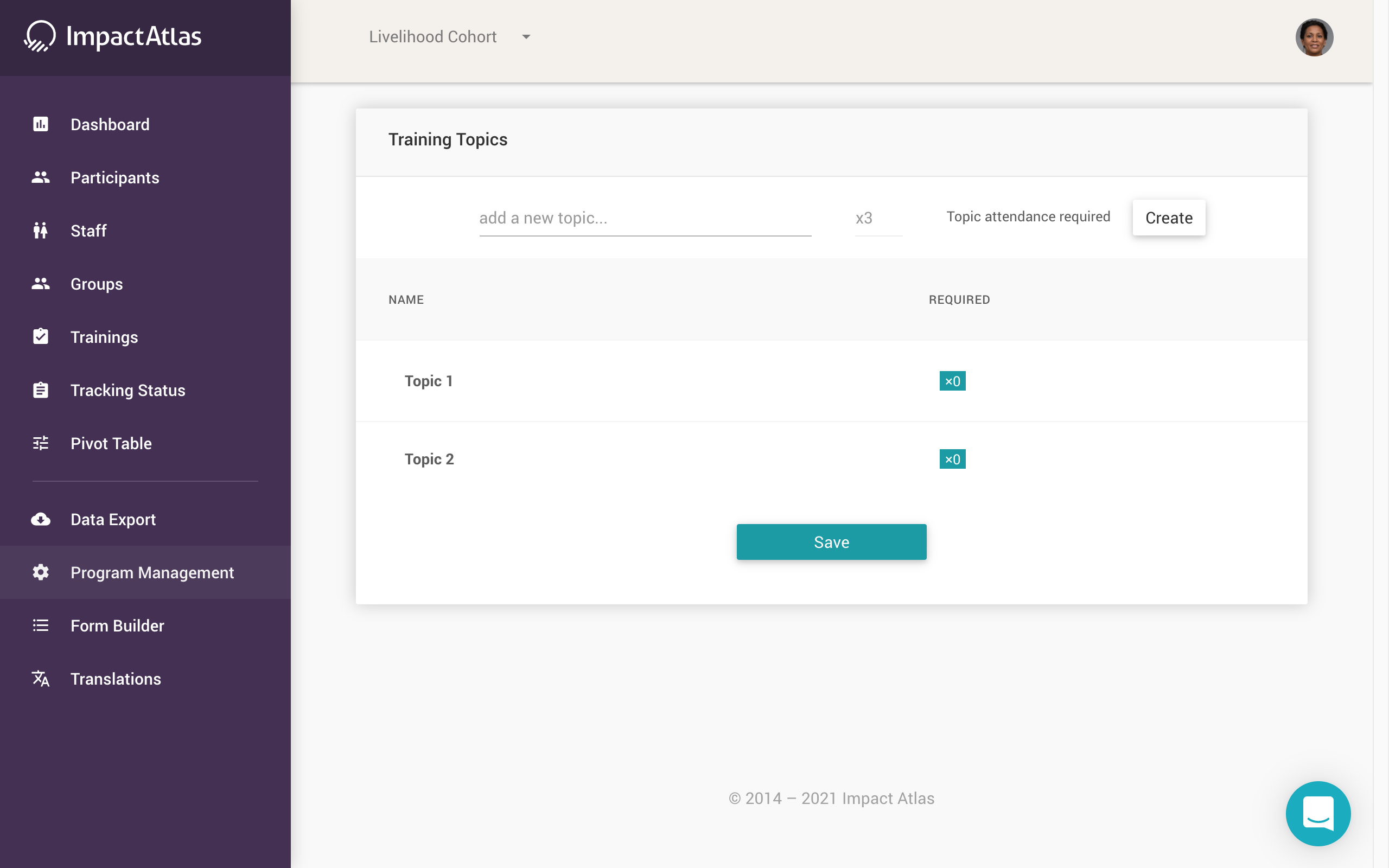 You can create new topics for your trainings under the Program Management widget. Creating new topics is only available for users with the permission to do so. To create a new topic that will appear in your Trainings widget, from the homepage go to Program Management on the lefthand navigation panel: