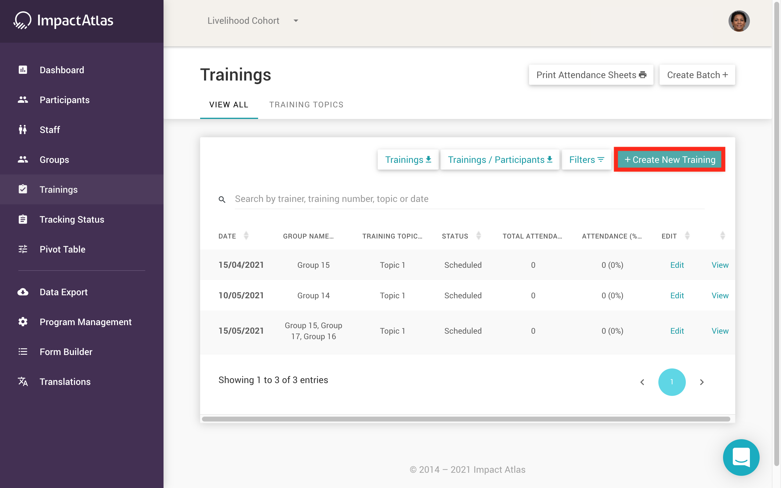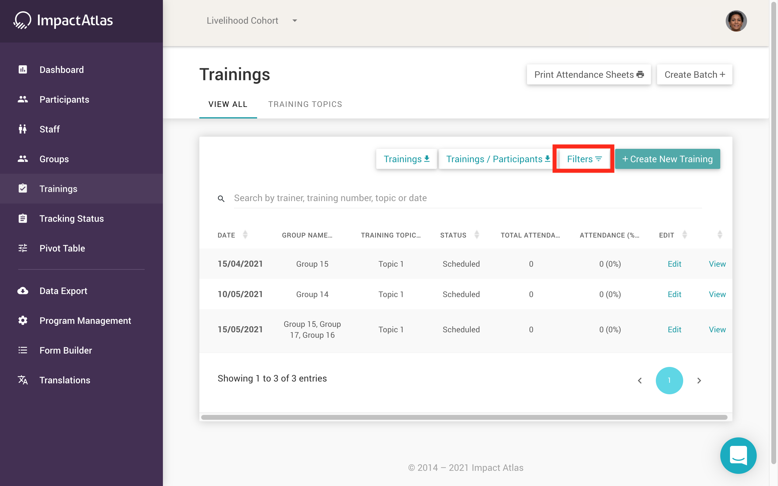 You can download the entire portfolio of trainings, attendance sheets, as well as trainings per participant using the widgets pictured below: