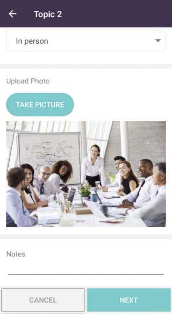 Fill out the requested information and in the bottom of the page there is the option to upload a photo. Click on "Take Picture" button and either upload or take a photo. Then, click on "Next" button to continue filling out the training attendance: